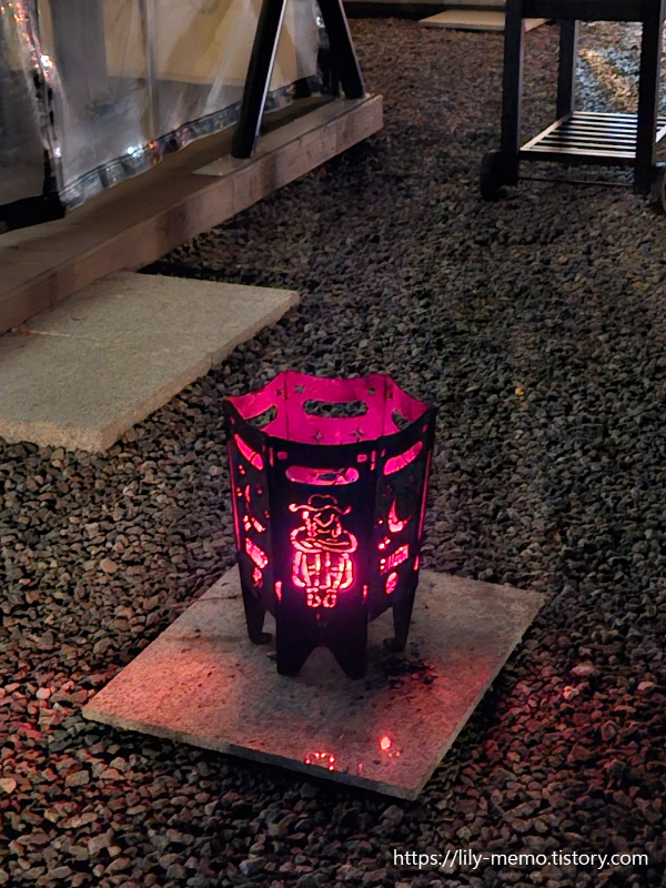 - 불멍 : 평화숲 글램핑에서는 저녁에 불멍을 할 수 있습니다. 불멍은 불을 피우고 주변의 소리와 풍경을 감상하는 것인데요, 평화숲 글램핑에서는 불멍 장소를 따로 마련해 주고, 불펜치와 숯도 제공해 줍니다. 저희는 불멍 장소에서 연인과 함께 달빛과 별빛을 보며 이야기를 나누었습니다. 도시에서는 볼 수 없는 아름다운 밤하늘과 따스한 불빛이 정말 인상적이었습니다.