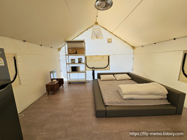 평화숲 글램핑은 넓고 깨끗한 시설과 객실로 만족스러웠습니다. 객실은 텐트형과 컨테이너형으로 나뉘어 있는데요, 저희는 텐트형 객실을 이용했습니다. 텐트형 객실은 에어컨과 난방이 잘 되어서 계절에 상관없이 편안하게 지낼 수 있었습니다. 또한 침대와 이불, 베개 등 침구류도 깔끔하고 편안했습니다. 객실 안에는 TV와 냉장고, 전기밥솥, 전자레인지 등의 가전제품도 구비되어 있어서 편리했습니다. 화장실도 깨끗하고 수압도 좋았습니다.