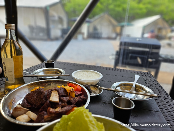 객실 바깥에는 바비큐 그릴과 테이블, 의자가 준비되어 있어 바비큐를 즐길 수 있었습니다. 바비큐 그릴은 석쇠와 숯, 등이 제공되고, 고기와 반찬은 따로 준비해야 합니다. 저희는 집에서 고기와 야채들을 가져왔습니다. 바비큐를 구워 먹으며 연인과 수다를 떨었는데, 정말 즐거운 시간이었습니다.