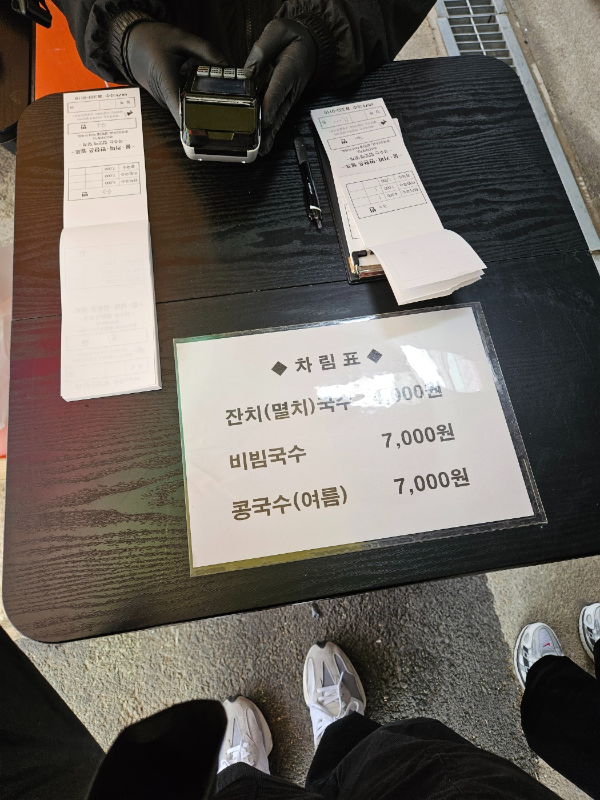 저는 비빔국수와 잔치국수를 각각 하나씩 주문했습니다. 비빔국수는 7천 원이고, 잔치국수는 4천 원입니다. 가격이 정말 저렴하죠? 메뉴판 사진과 가격을 함께 보여드립니다.