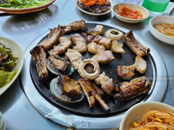 바베큐 메뉴는 세트와 단품으로 나뉘어 있어요. 저희는 삼겹살 2인분, 항정살 1인분, 민물장어 1마리를 주문했어요. 민물장어는 가격대별로 선택할 수 있었는데 저희는 3만 원대의 장어를 골랐습니다. 사이드 메뉴로는 된장찌개와 양푼 비빔밥을 추가했습니다. 밑반찬은 셀프바에서 가져올 수 있었고 전복과 꽃게가 들어있는 잔치국수도 제공되었습니다.