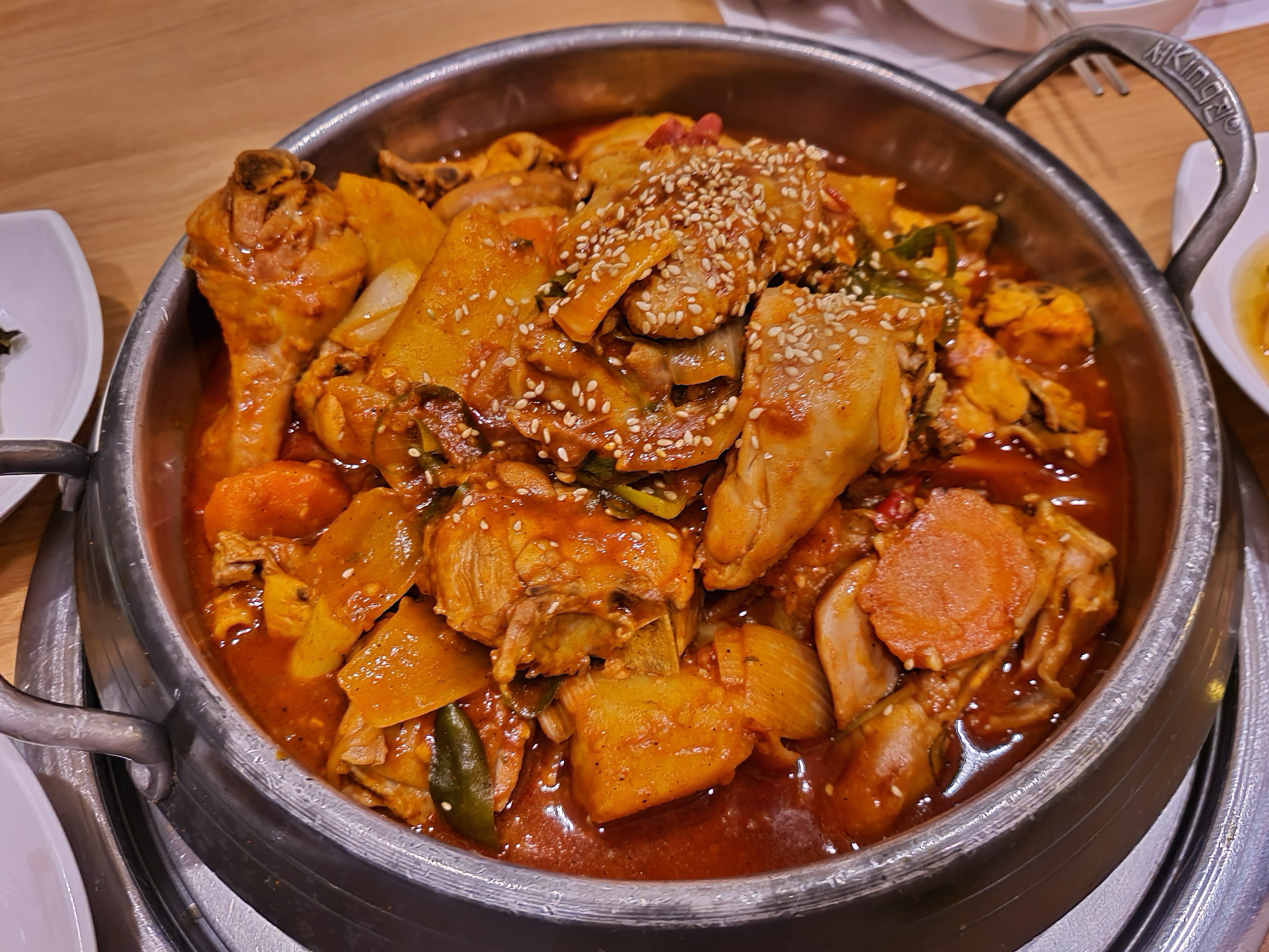 그럼 이제 제가 먹어본 행주산성 강마루 닭볶음탕의 맛에 대해 솔직하게 후기를 남기겠습니다. 행주산성 강마루 닭볶음탕은 국물이 진하고 매운 편입니다. 국물에는 고춧가루와 고추장 등의 양념이 들어가 있으며, 야채와 떡이 잘 어울립니다. 기본 반찬으로 제가 방문했을 때 도토리묵, 양파절임 깍두기 등이 나왔는데 매번 바뀌는 것인지는 모르겠습니다.