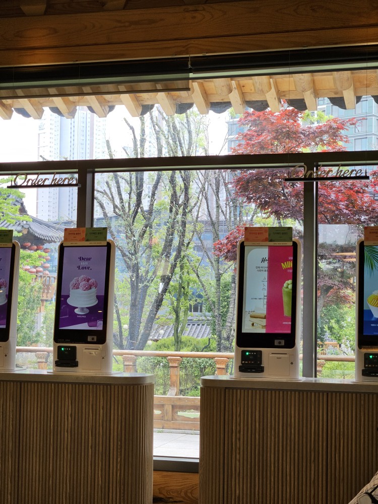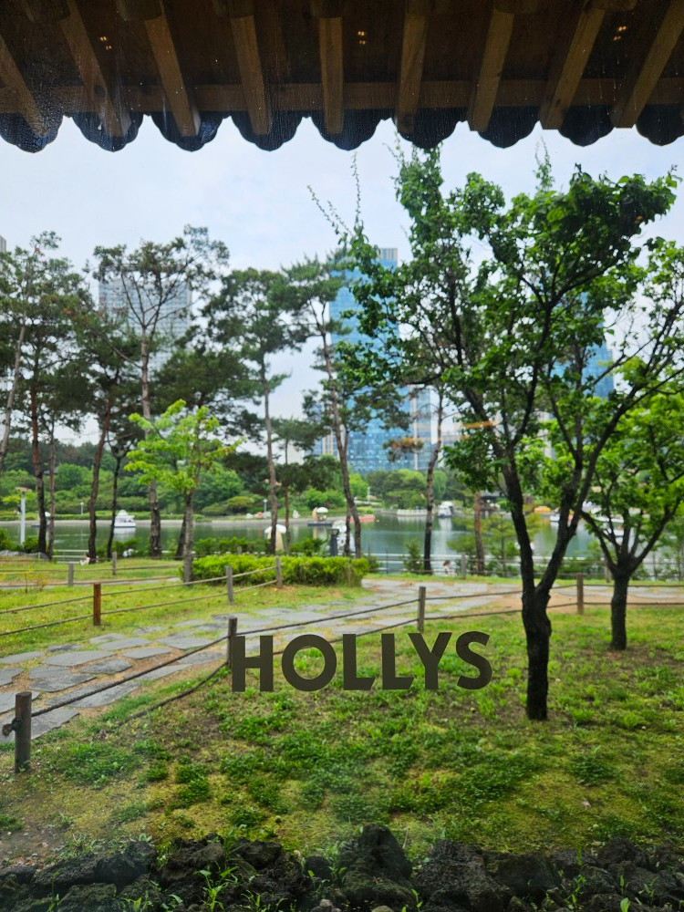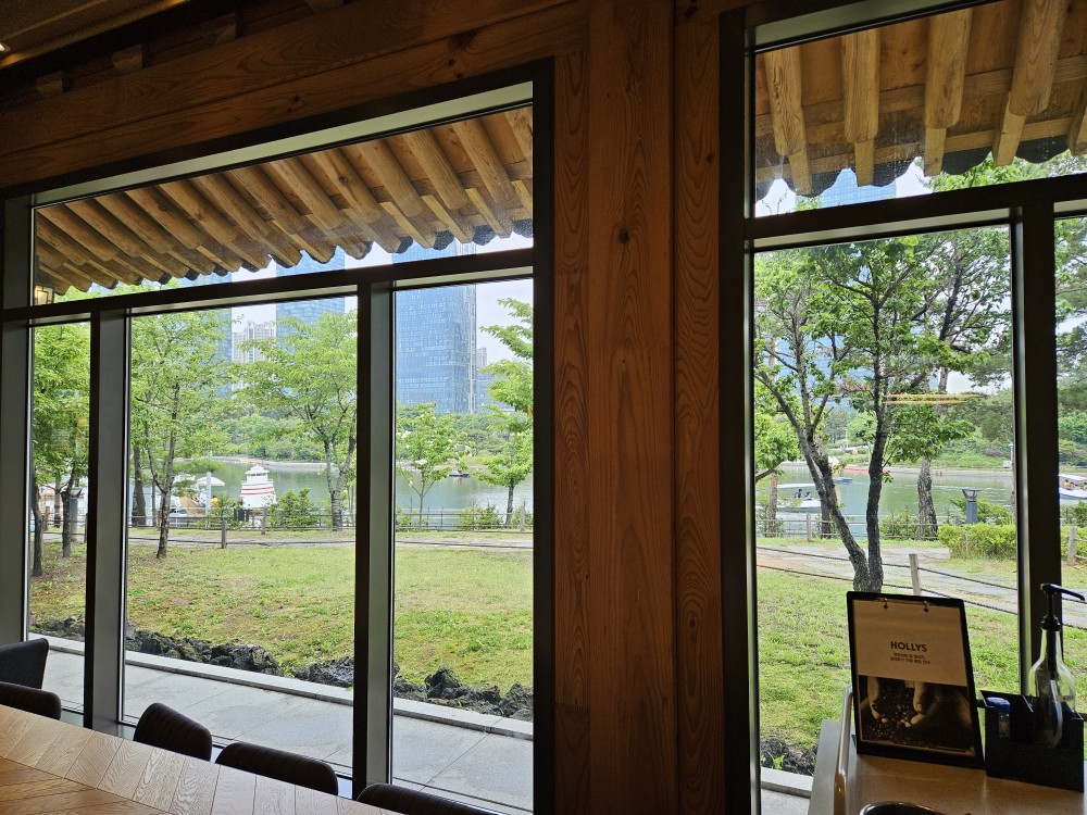 매장은 공간분리 없이 하나로 쭉 이어져 있습니다. 한쪽으로 긴 구조인데요. 양 옆으로 유리로 되어 있어서 센트럴파크와 한옥마을 내부가 보입니다. 특히 강이 보이는 쪽으로는 커다란 창문이 있어서 노을과 야경을 바라보기 좋습니다. 저는 운 좋게 창가자리에 앉았는데요. 공원과 강이 보이는 풍경이 너무 아름다웠습니다. 저녁 시간대에 가시면 더 멋진 모습을 볼 수 있을 거예요.