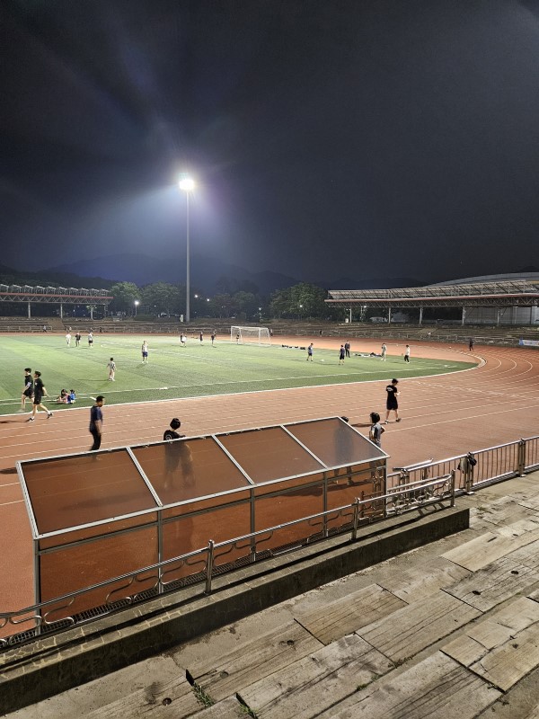 축구장 안에는 육상트랙도 있습니다. 육상트랙은 400m x 8코스로 되어 있어서 달리기를 즐기는 사람들에게 좋습니다. 육상트랙은 우레탄코트로 되어 있어서 발에 부담이 적고 탄력이 좋습니다. 저희는 경기 전후에 육상트랙에서 달리기를 해서 체력을 기르고 스트레칭을 했습니다.