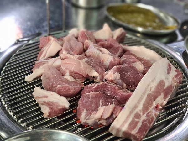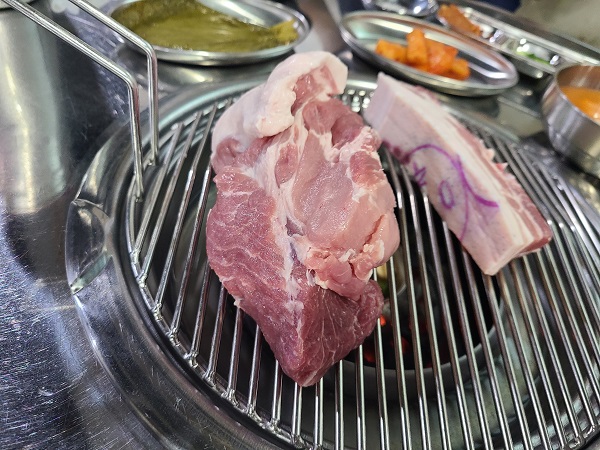 곧바로 고기가 나왔습니다. 고기는 사장님이 직접 구워주셨습니다. 사장님은 정말 친절하셨고, 고기를 어떻게 먹으면 맛있는지 알려주셨습니다. 고기는 두껍게 잘라서 구워주셨는데, 육즙이 흘러나오는 것을 볼 수 있었습니다. 삼겹살은 껍질 부분이 바삭하고 살 부분은 부드럽고 육즙이 가득했습니다. 목살은 쫄깃하고 실하며, 멜젓에 찍어서 먹으면 입 안 가득 고기의 맛이 퍼졌습니다.