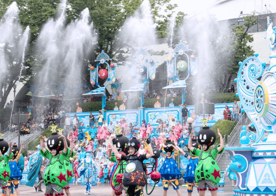 물 맞는 콘텐츠 중에서 가장 인기 있는 것은 카니발 광장에서 하루 2번씩 펼쳐지는 초대형 워터쇼 '슈팅워터펀'입니다. 이 공연은 약 30분간 사방에서 시원하게 물이 쏟아지는데요, 워터 레인저스와 밤밤맨과의 대결로 전개되는 스토리에 맞춰 관객들도 객석과 무대를 오가며 물총 싸움을 펼치는 고객 참여형 공연입니다. 공연 직후에는 모든 연기자들과 객석에 있던 관객들이 광장으로 나와 시원한 물을 맞으며 신나는 클럽 음악에 맞춰 춤추고 뛰어노는 '밤밤클럽'이 피날레를 장식합니다. 저도 이 공연을 보고 정말 재미있었어요. 물이 너무 시원하고, 음악도 신나고, 연기자들도 열정적이고, 분위기도 최고였습니다. 다만, 이 공연을 보려면 미리 자리를 잡아야 하고, 물이 정말 많이 튀기 때문에 비옷이나 수건을 준비해야 합니다.